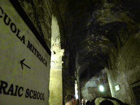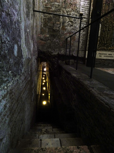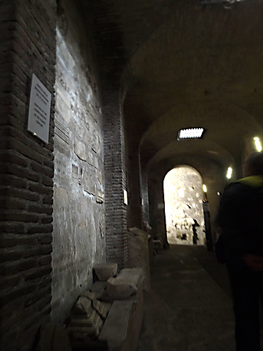 *San Clemente is another amazing church, but not because of all the impressive baroque architecture. This one is 3 levels of Roman history penetrating to it's original base way underground - a pagan temple built during the 1st century. Walls are low and built over a rushing stream, which can be heard below the floor. In those times, pathways were narrow, crowded, built like a maze. Eventually, the outer ground level rose above the church, and another 4th century church was built atop the walls of the temple. It's walls are squatter, stronger, and arched, which eventually supported the third level, a 12th century church. Medieval frescos were saved, as were columns and tiles and stonework from many other locations that were brought to build this one. "Cartoons", the initial sketch of a fresco, were discovered at a lower level, and since the lines & colors were embedded in the plaster, the whole wall was lifted to be preserved and displayed at the top level. Most amazing to me, is that 70% of the ongoing excavations are not open to the public - imagine how much more of this site exists! I like mystery and exploring old places and San Clemente does not disappoint. Since photographs are not allowed in the lower levels, below is a pic from online.