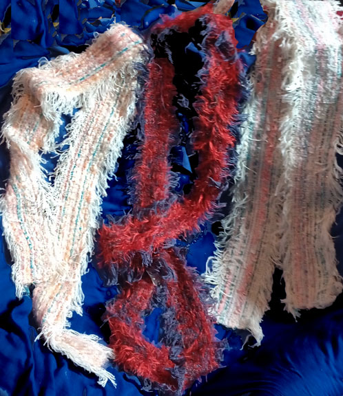 Tri-Scarves: see below. Triangle weaving is a great project for DIY crafters. Since they are done on frames, no traditional loom nor experience is needed. Ask about workshops offered in this fun technique... (Learn