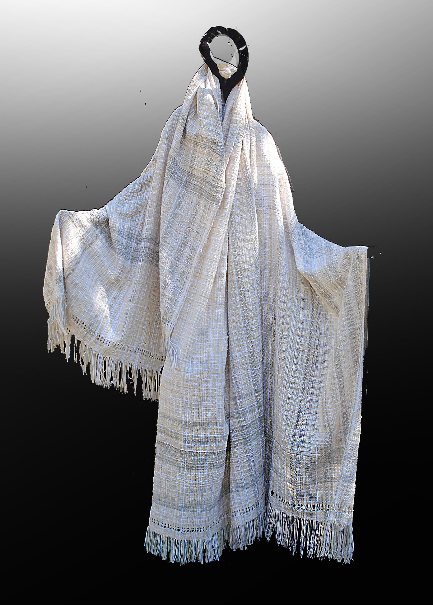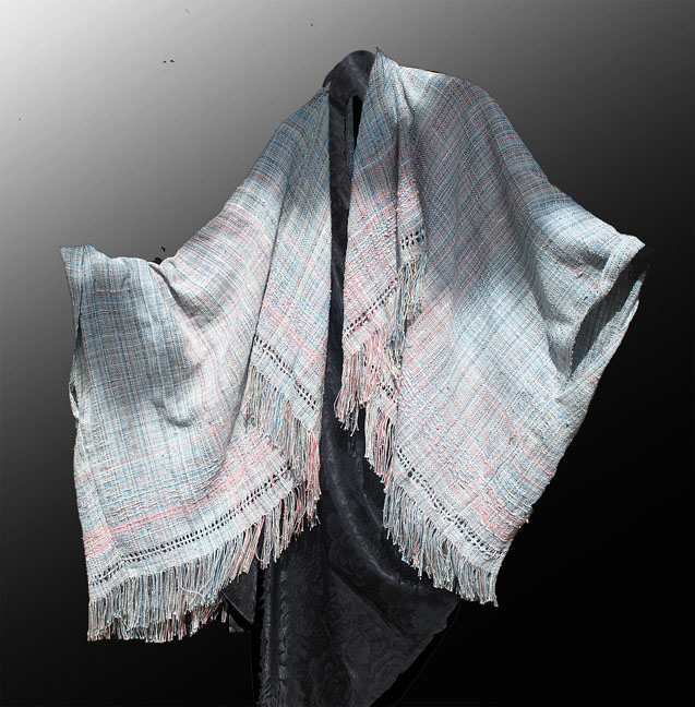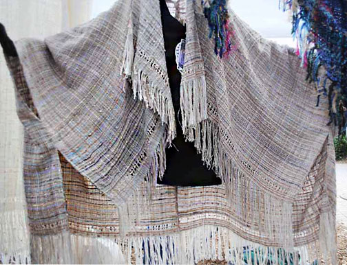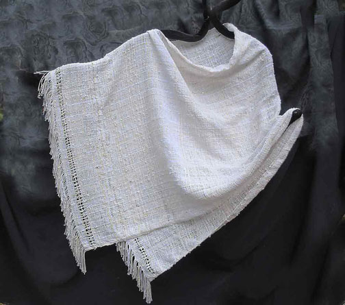 Capes : lightweight cotton, seamed at one shoulder giving a wide boat neckline. This one has rows of leno-lace and added sparkle. This style can be shifted from side to side, spun around back to front, or with fringe pointed down. Versatile and light.