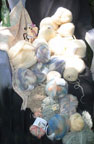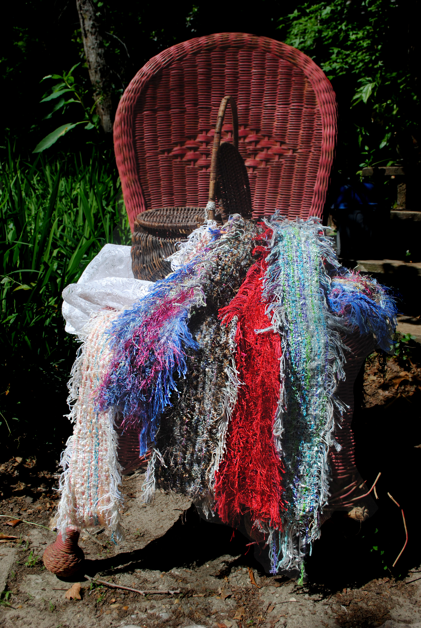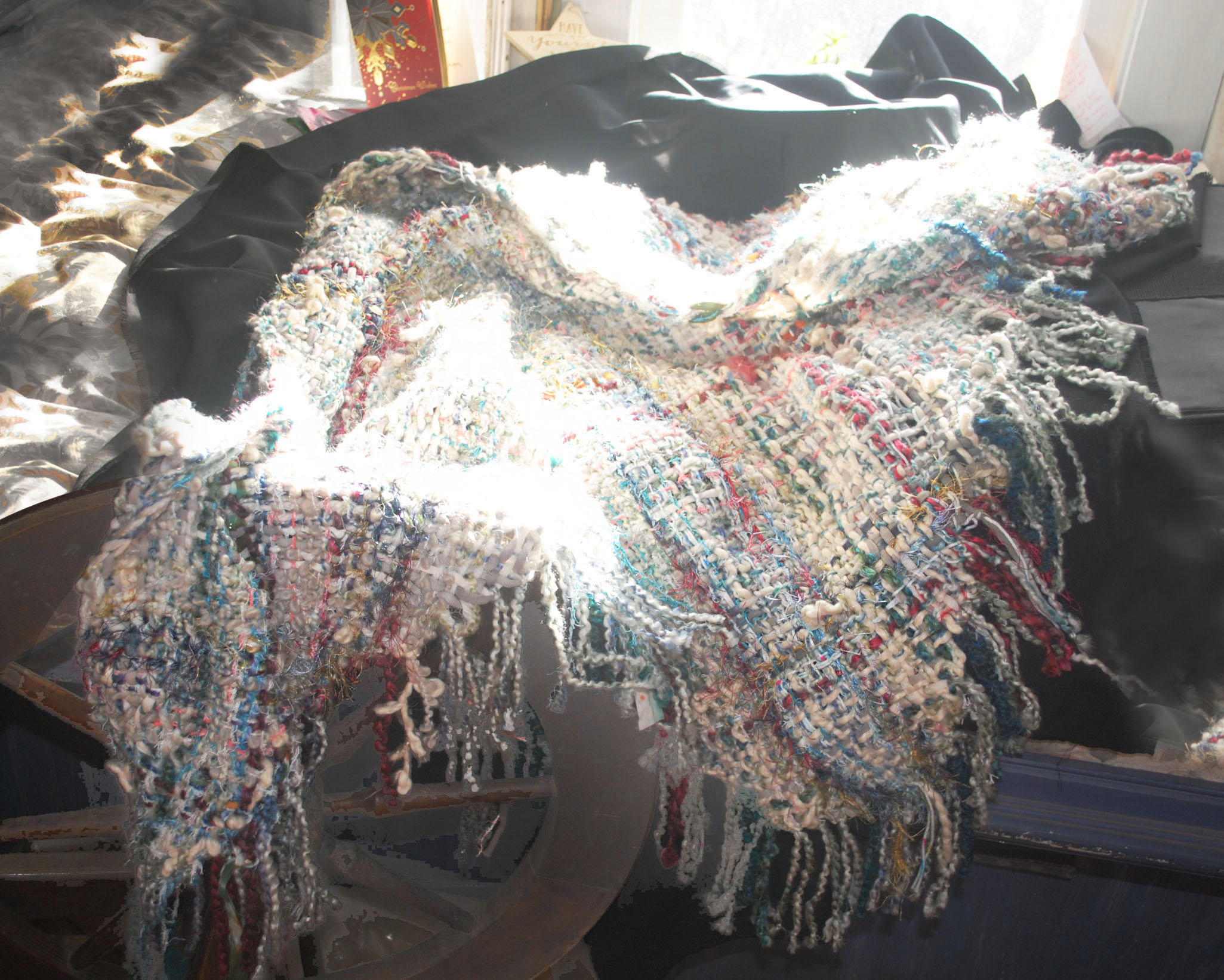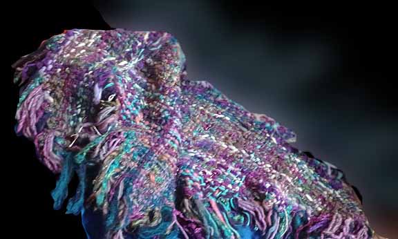 ![]() TriWoven Throw, woven on a 7-ft. frame, it ends up as 6x5x5. This one incorporates many fibers, textures, loops and nubs, beads and ribbons. A great coverup for chilly evenings. $186 |