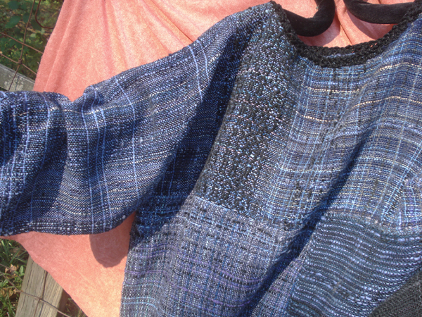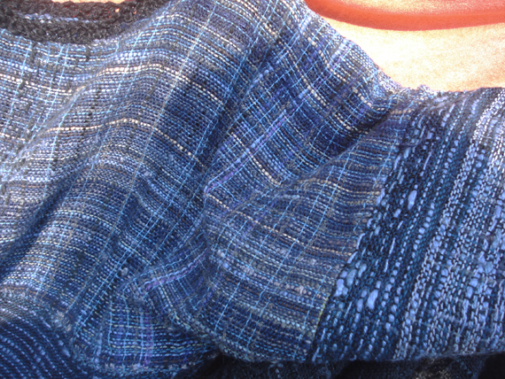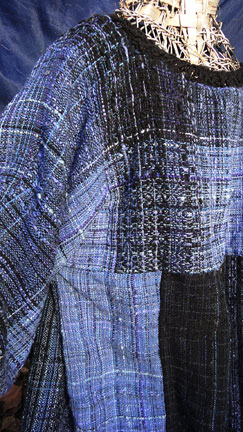 subdued. In contrast, many weavers put all their variety into the warp (vertical), then use 1-2 yarns for a simplified weft (horizontal). I use as many as a dozen yarns in both warp & weft. |