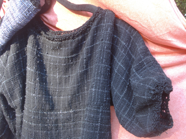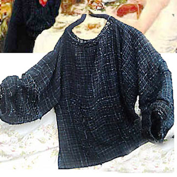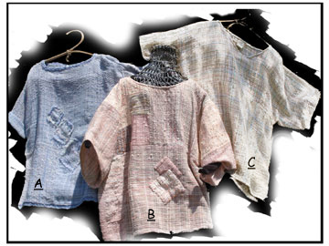 ![]() Blue - appliqued diamonds and a ribbed hem.. Pink - patchwork with a variety of weaves appliqued together, and ribbed sleeves.. Oatmeal/beige - a v-neck, with strands of pastel colors, and open slit sides. |