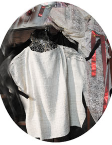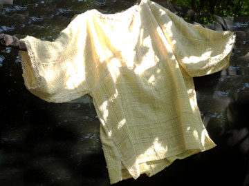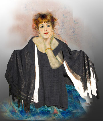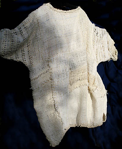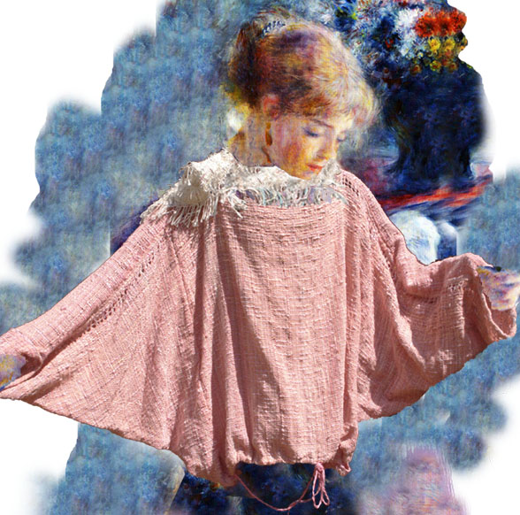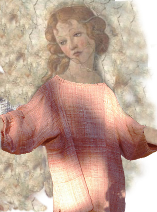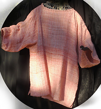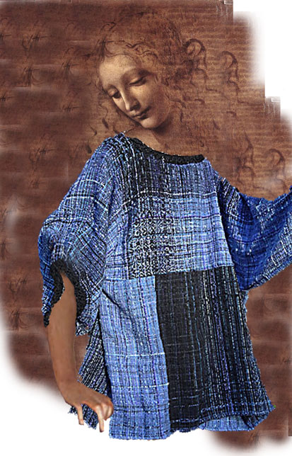To commission a one-of-a-kind top, contact me with your choices of options. Choose: 1. style, 2. color, 3. Size: s, m, l. Most weavings are one predominant color with several alternate shades of the same color (or another) mixed in. Prices range from $125 - $165, depending on style, complexity of colors, & weave or lace pattern. For more info, click on link choices above. With your request, you'll receive a descriptive statement and yarn samples. Deposit by check, Visa/MC, or Paypal. For tops readily available, see Ready For Your Now. | ||